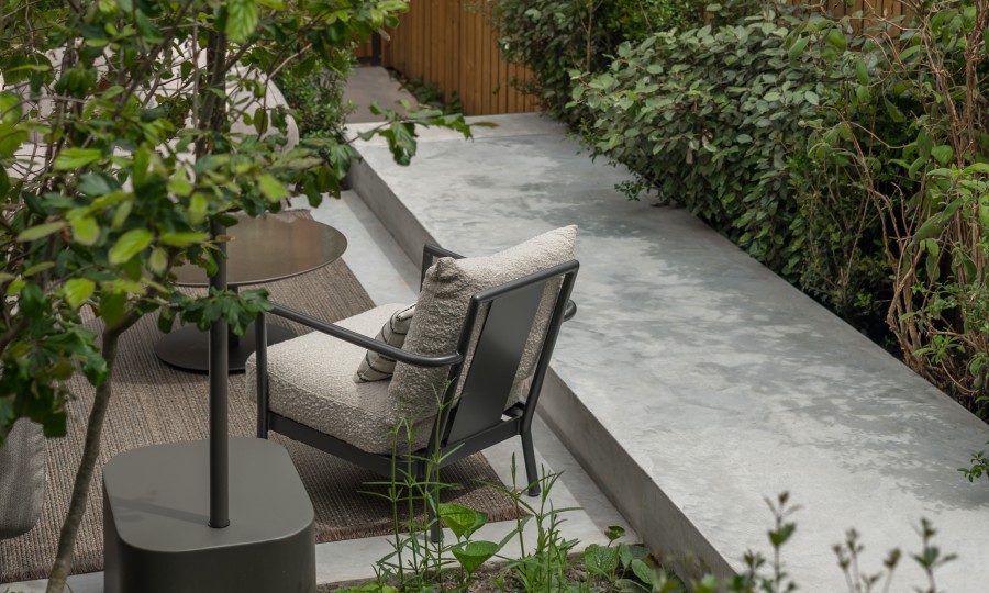 Following the renovation of this classic city-center building, the backyard was redesigned to complement the modern extension. A raised concrete catwalk serves as a floating element, connecting the different levels, including the terrace and storage area. The garden is framed by greenery, creating a sense of calm, cohesion, and a sheltered atmosphere.
