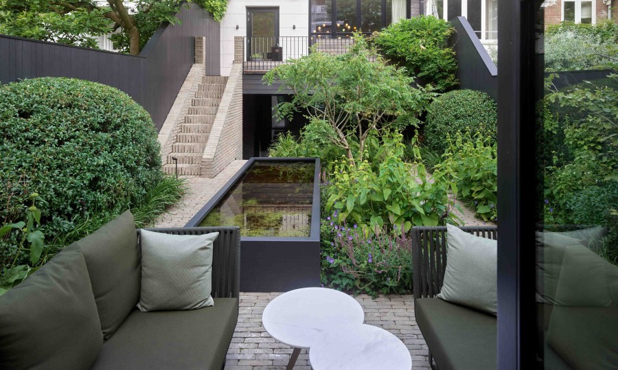 Deze besloten stadstuin is ontworpen als verlengstuk van de woning. Door de verschillende niveaus ontstaat vanuit elke verdieping direct contact met het groen. Royale trappen en het consequente gebruik van materialen zorgen voor samenhang. Maatwerkmeubilair versterkt de functionaliteit en maakt de tuin geschikt voor uiteenlopende momenten, het hele jaar door.